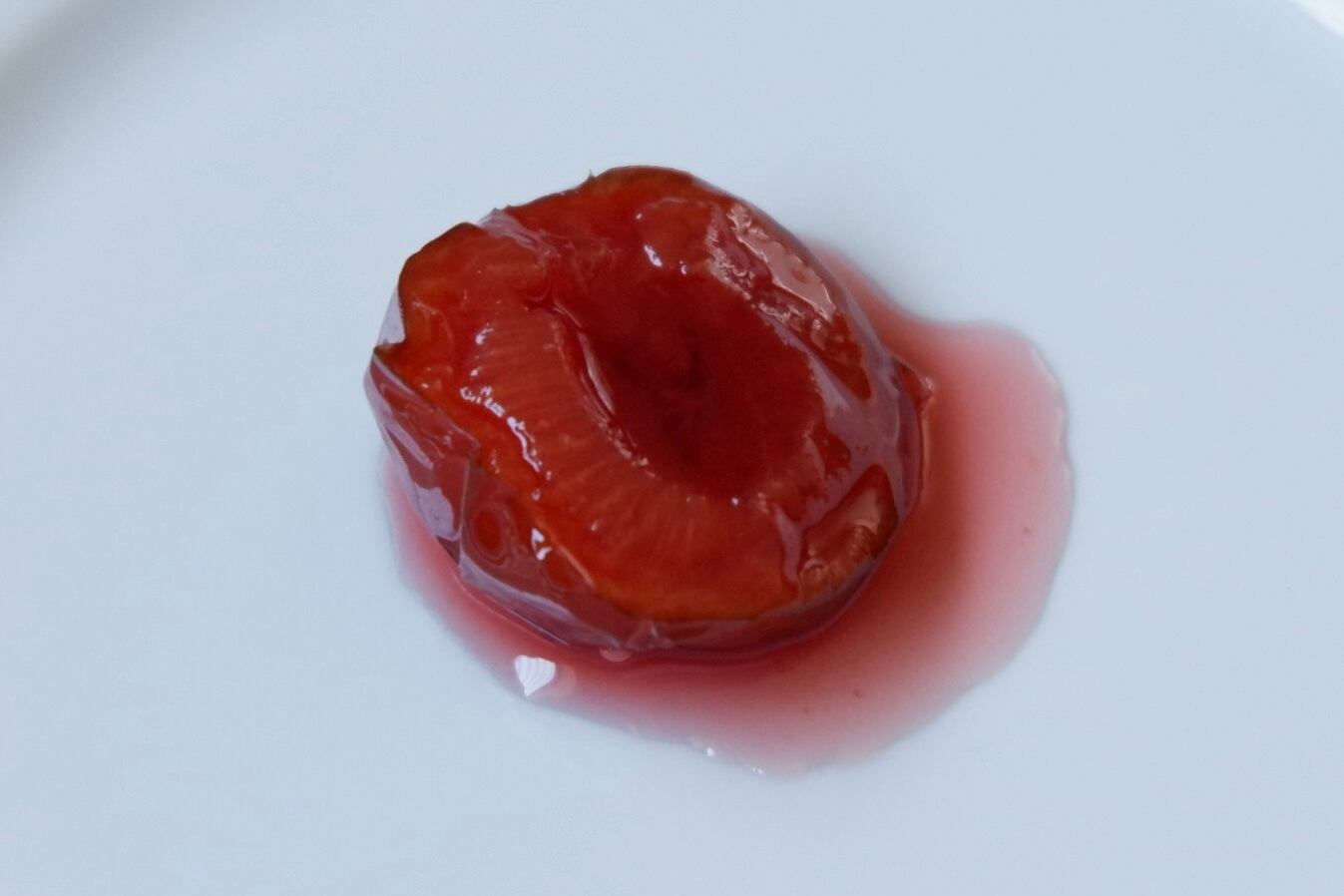 しっかり追熟させて、せっかく小ぶりで果肉が煮崩れにくいので、コンポートのような(水は加えていません)仕上げにしました。